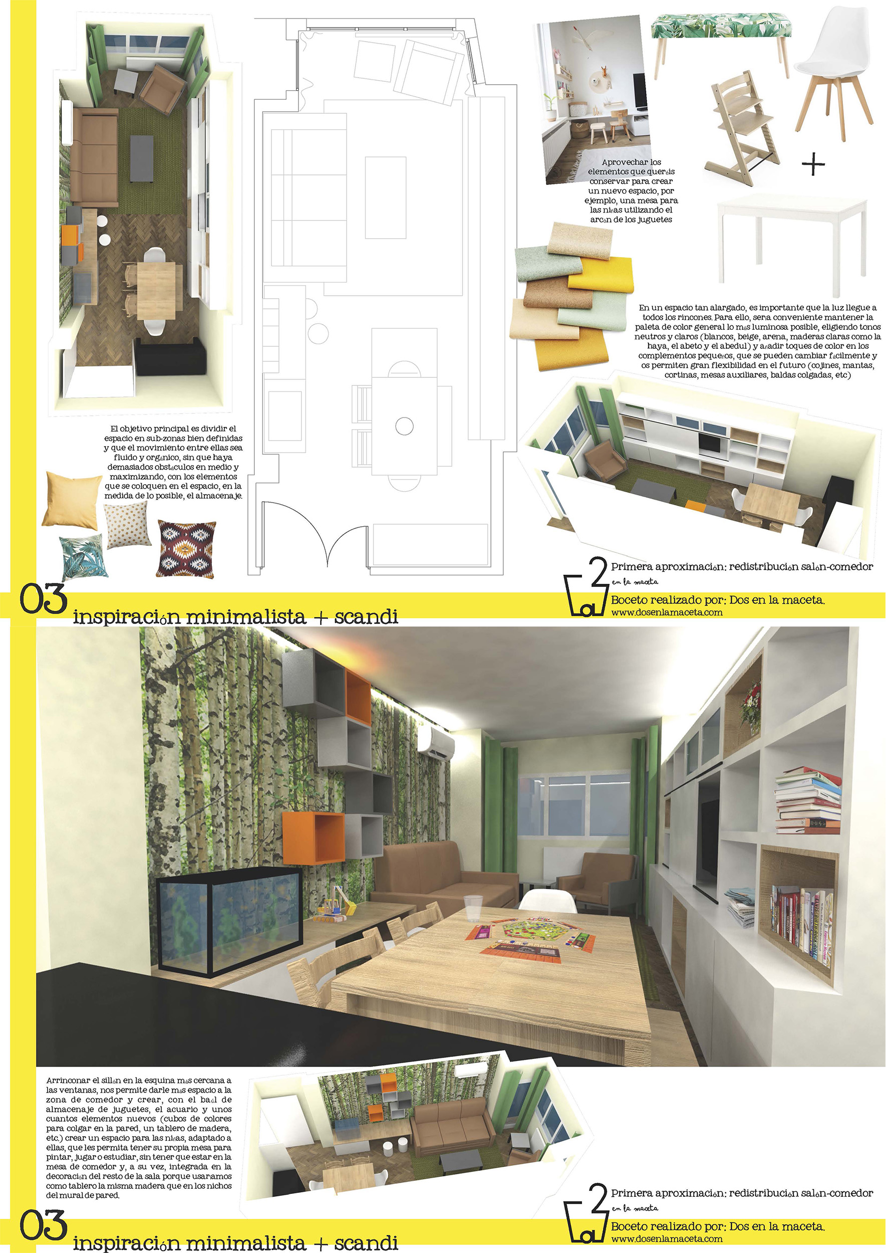 Al contar con un espacio reducido en dimensiones y muy alargado, la configuración general no podía cambiar demasiado. Cada pieza, especialmente las grandes (sofá, TV y mesa de comedor), debía ir donde se encontraba así que nos centramos en integrar todos los elementos entre sí, destacando algunas áreas con toques de color y buscando o diseñando piezas muy funcionales.