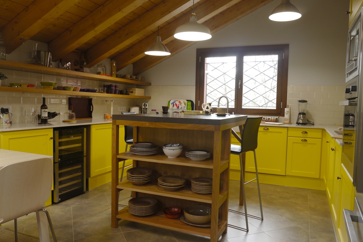 La cocina que hemos diseñado es amplia, luminosa y alegre. El color amarillo inunda el espacio y crea un ambiente agradable y distendido. Los muebles lacados y las encimeras de diferentes materiales ayudan a conseguir ese aire de campiña inglesa que nos habían pedido.